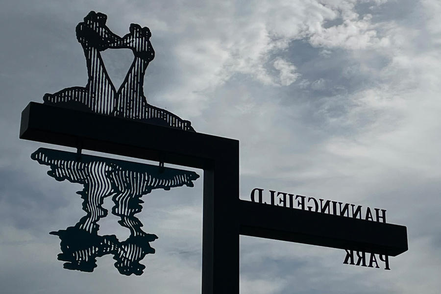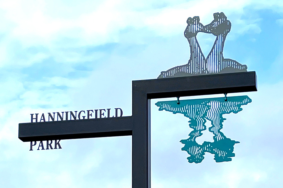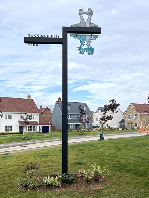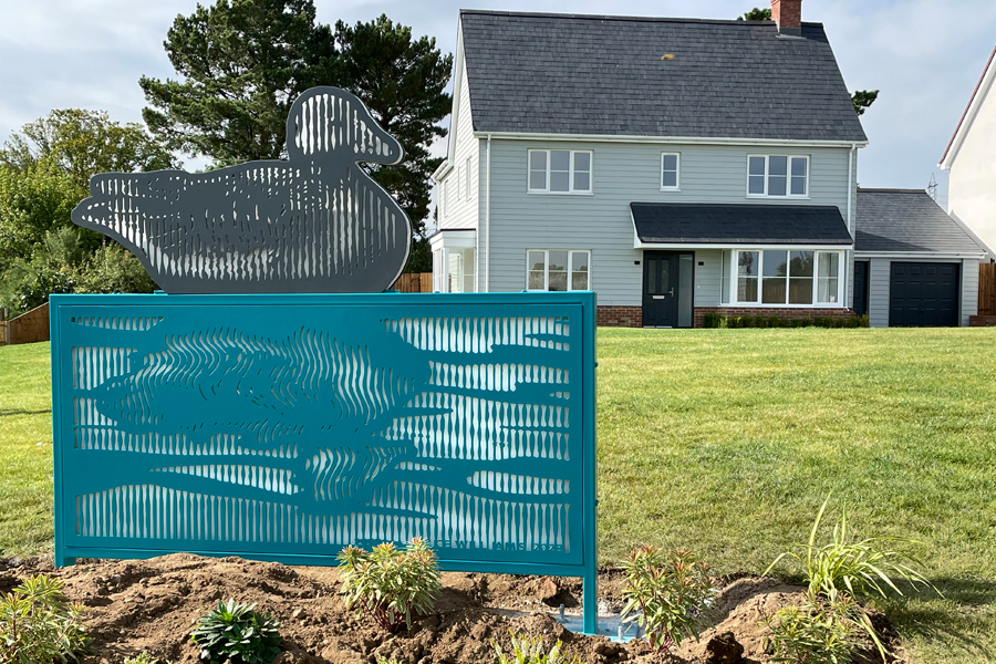 Great crested grebes and a greylag goose from near by Hanningfield Reservoir, mark the entrance to an Essex Housing Estate built by Randall Watts Limited. The reflected grebe image swings in the wind. Managed by Alison Turnbull
