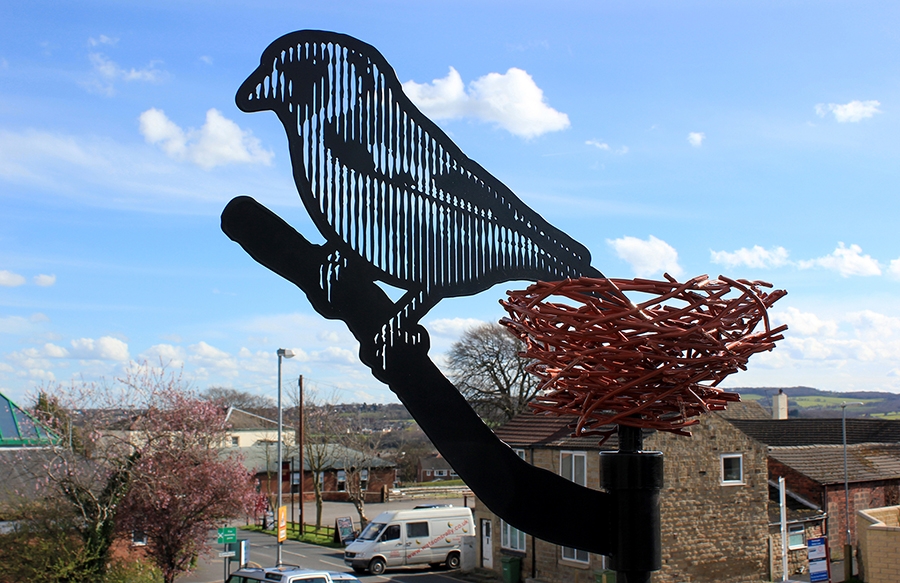 Cluntergate CLUNTERGATE Cluntergate Bird, Horbury, West Yorkshire 2016 A goldfinch weather vane spins around its nest on The Cluntergate Centre. Laser-cut steel, galvanized painted and power coated. 5m high, bird approx 0.5mx0.5m. Commissioned by Horbury Community Centre Trust.Managed by RKL Consultants. Back