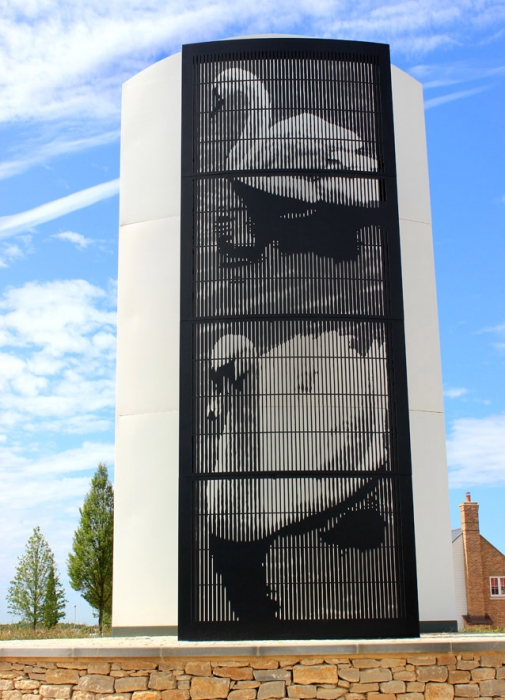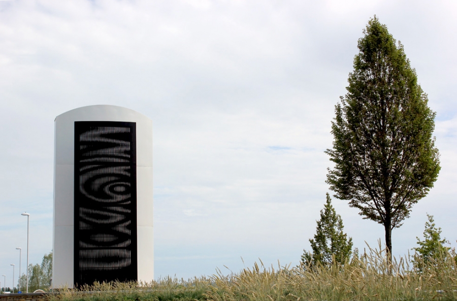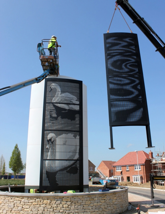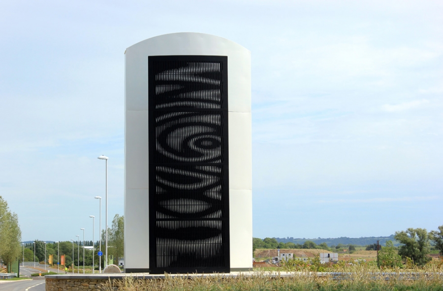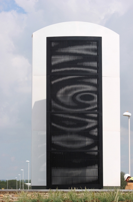 Laser-cut steel, galvanized and powder coated. 6m high x 3.5m wide x 3.5m deep,