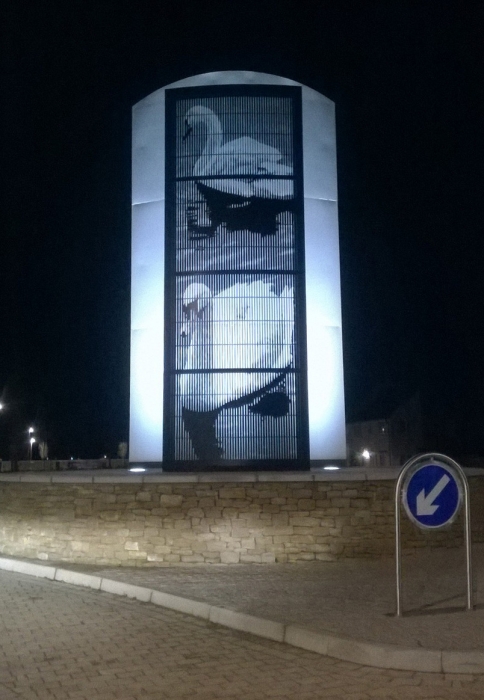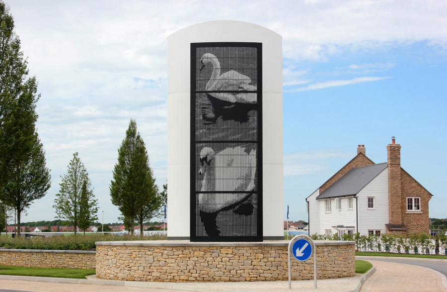 Swans float gracefully on the water as the viewer approaches the new community of Finberry, near Ashford, Kent.