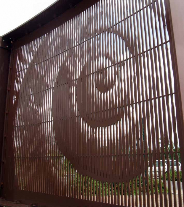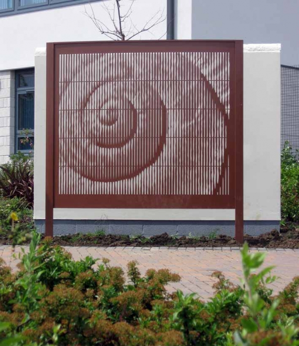 Laser cut steel, galvanized & painted, with rendered and painted block walls.