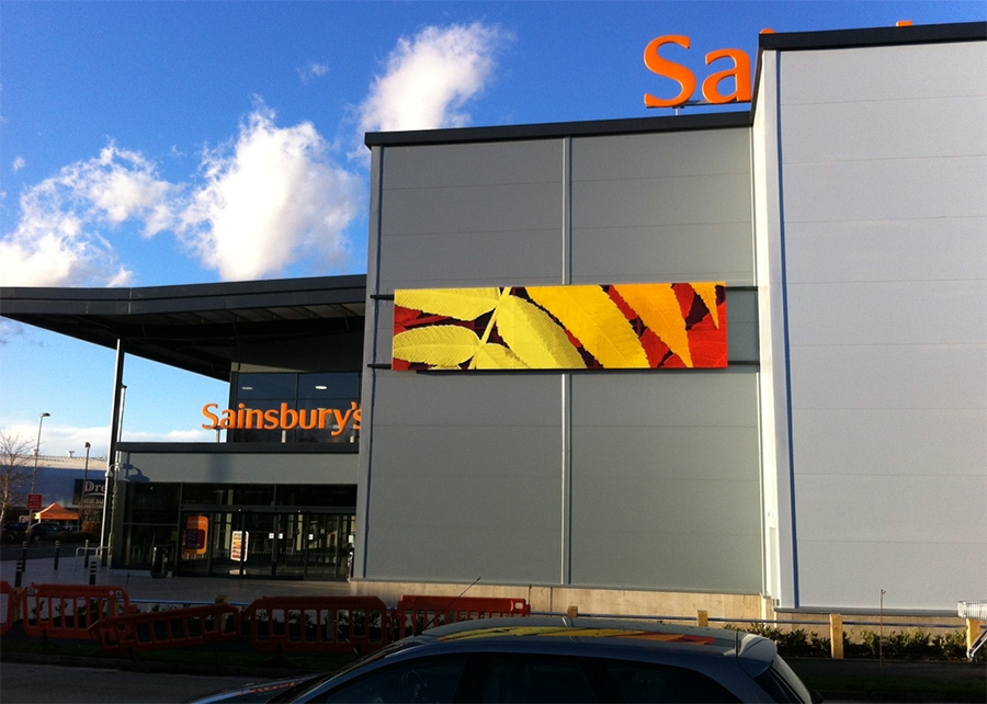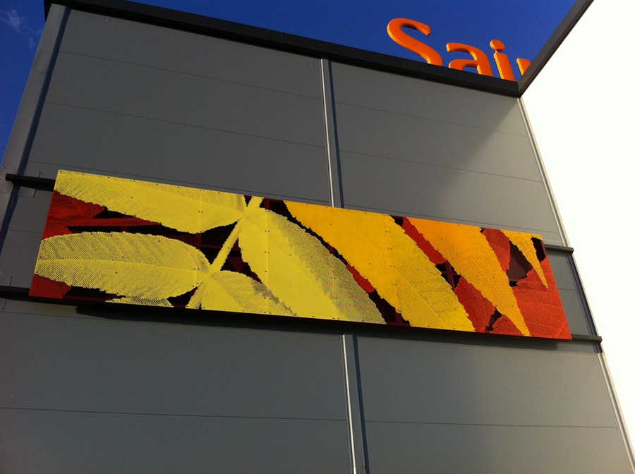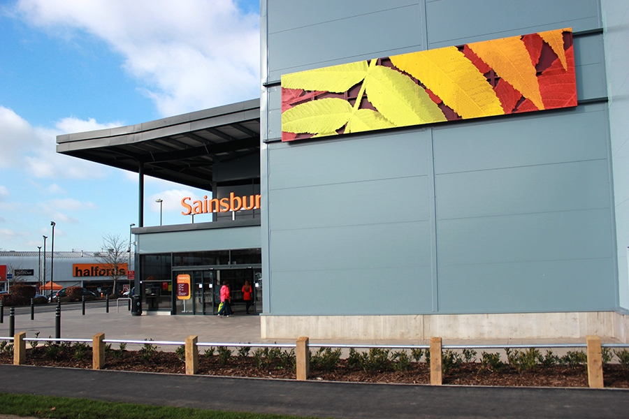 An autumnal frond of leaves greatly enlarged and punched in powder coated steel. Commissioned by Sainsburys for a new store in Waterlooville, Hampshire. Managed by RG Group.